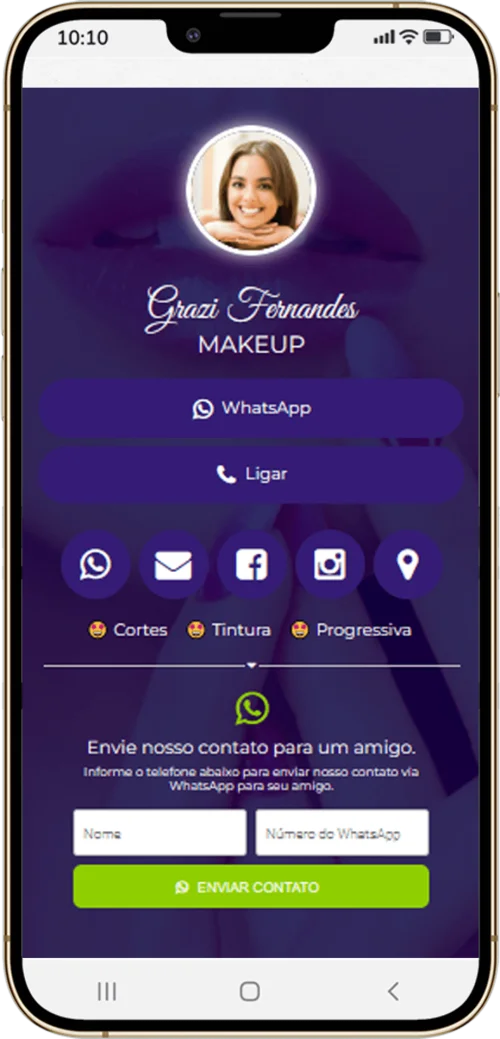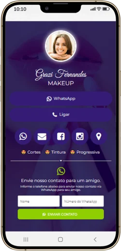 O Cartão de Visita Online funciona como um mini site, você pode compartilhar por WhatsApp ou em suas Redes Sociais.